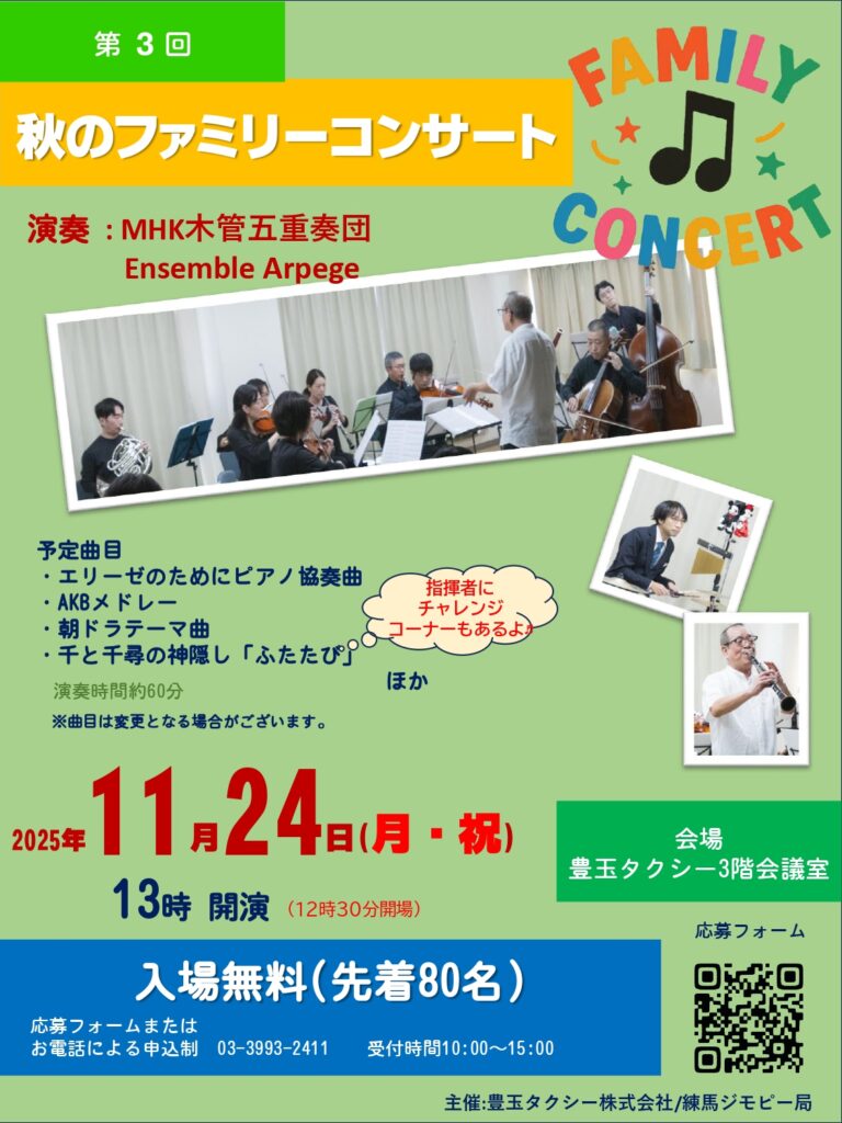 11月24日(月・祝)13時より豊玉タクシーで第3回秋のファミリーコンサートを開催します!